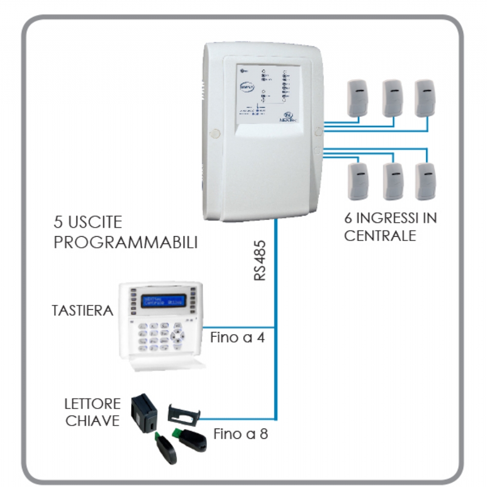 SIMPLY, per le sue prestazioni e per la sua versatilità è la soluzione ideale per applicazioni residenziali e commerciali di piccole dimensioni. Si distingue sia per la programmazione facile ed intuitiva per l’installatore, sia per l’estrema semplicità di utilizzo studiata ad hoc per l’utente. La centrale riconosce automaticamente le periferiche come lettori chiave e tastiere, utilizzati anche per la programmazione, creata per effettuare una gestione semplice e veloce del sistema. Inoltre la Programmazione semplificata tramite DIP SWITCH permette di programmare la centrale anche senza tastiera.